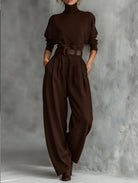 Refined Minimalist Aesthetic: Clean lines and a uniform shape make this garment effortlessly striking. The turtleneck adds a modern, confident touch. The pleated pants provide depth and movement. It is the perfect choice for anyone who wants to combine simplicity with a bold presence.